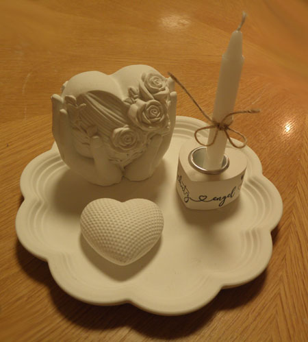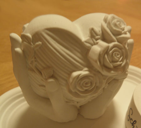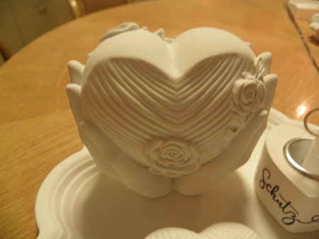 Geschenk-Set Skulptur "Zwei Hände halten Rosen-Herz" einem Geschenk-Karton und einer kleinen Karte für "Herzvolle Grüße".