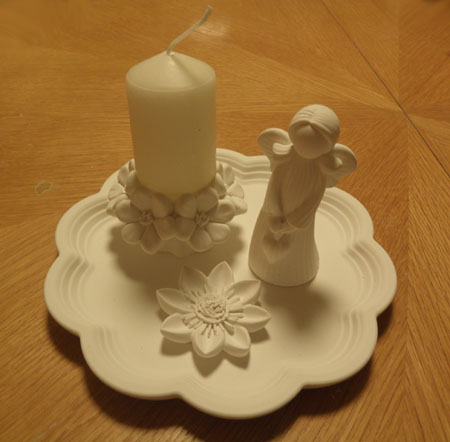 Eine Schale mit einem Herz-Engel, einem Blumen-Kerzenständer, einer Kerze, ... noch einer Blume im Geschenk-Karton und einer Engels-Karte.