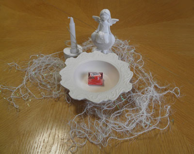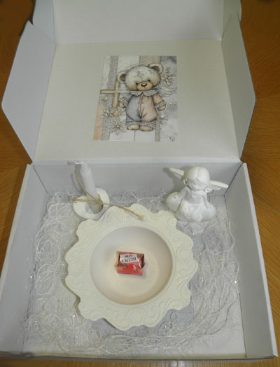 Geschenke-Set einem lächelnden Engel, der auf einem Herz sitzt