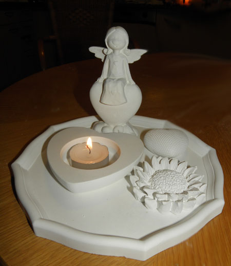 Geschenk-Set Ein lächelnder Schutz-Engel, der auf einem Herz sitzt auf einem 8-eckigen Tablett. Mit viel Herz und eineTeelicht im Geschenk-Karton und einer Karte für " Grüße aus dem Herzen ".