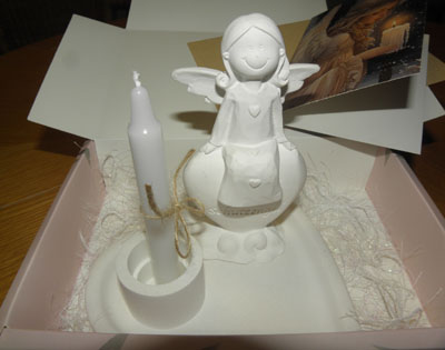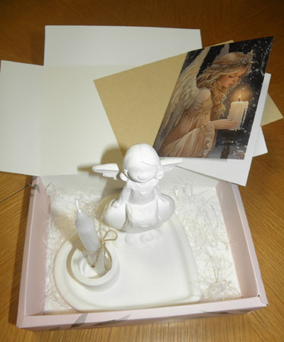 Geschenke-Set mit einem lächelnden Schutzengel, einem Tablett in Herzform mit Kerzenständer, kleiner weißen Kerze und einer bezaubernden Engels-Karte.
