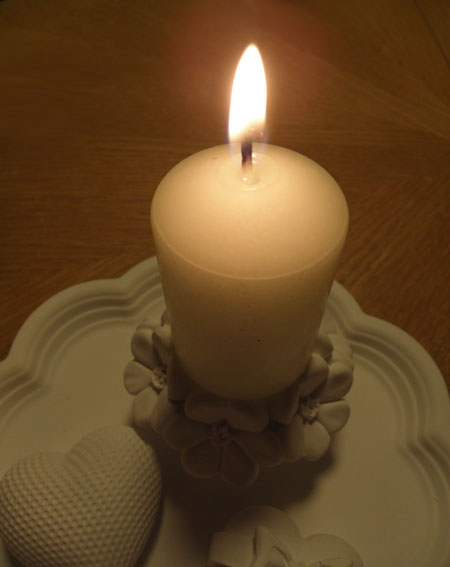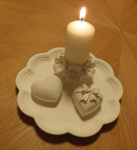 Geschenke-Set Rundes Tablett mit Rand, einem Blumen-Kerzenständer mit Kerze, einem geriffelten Herz und einem Herz mit Schleife