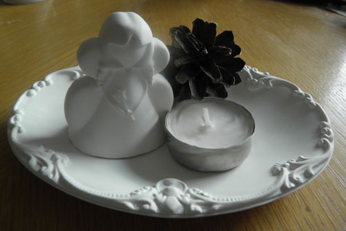 mit kleiner Schale, Zapfen und einem Teelicht,