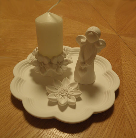 Eine Schale mit einem Herz-Engel, einem Blumen-Kerzenständer, einer Kerze, ... noch einer Blume im Geschenk-Karton und einer Engels-Karte.