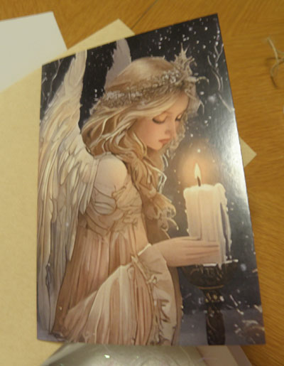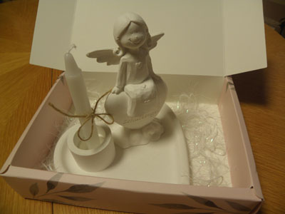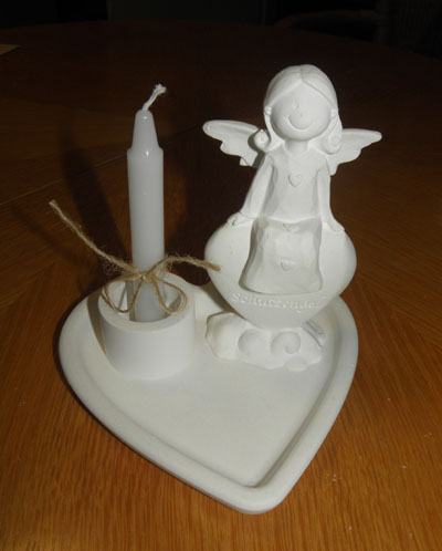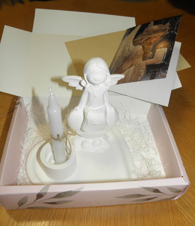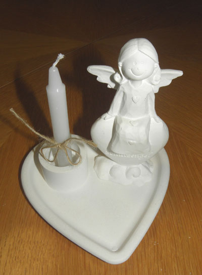 Geschenke-Set mit einem lächelnden Schutzengel, einem Tablett in Herzform mit Kerzenständer, kleiner weißen Kerze und einer bezaubernden Engels-Karte.