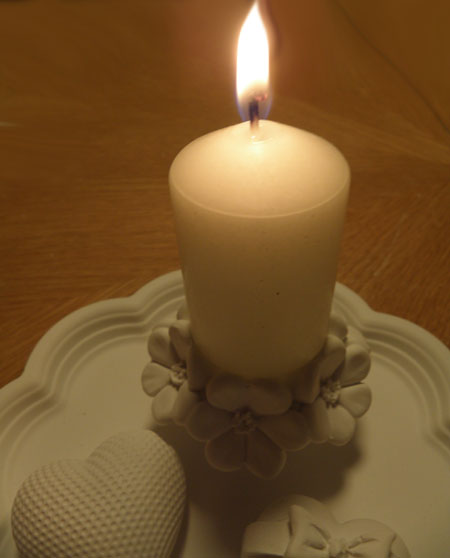 Geschenke-Set Rundes Tablett mit Rand, einem Blumen-Kerzenständer mit Kerze, einem geriffelten Herz und einem Herz mit Schleife