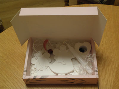 einem Geschenk-Karton und einer Karte.
